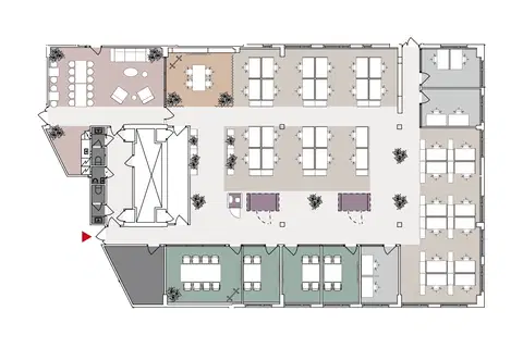 Toimitilasta on saatavilla valmis sovituskuva, josta käy ilmi tarkempi työpistemäärä ja tilan eri toiminnot.