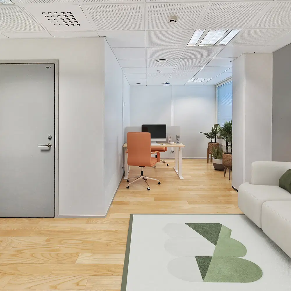 Vapautumassa 4. kerroksen kompakti toimitila 1-2 hlölle, jonne hissillä suora käynti pääaulasta ja parkkihallista. Tilassa suuret ikkunat antavat tilaan avaruutta. Ilmoitettu neliömäärä sisältää jyvityksen kiinteistön yhteisistä tiloista.
