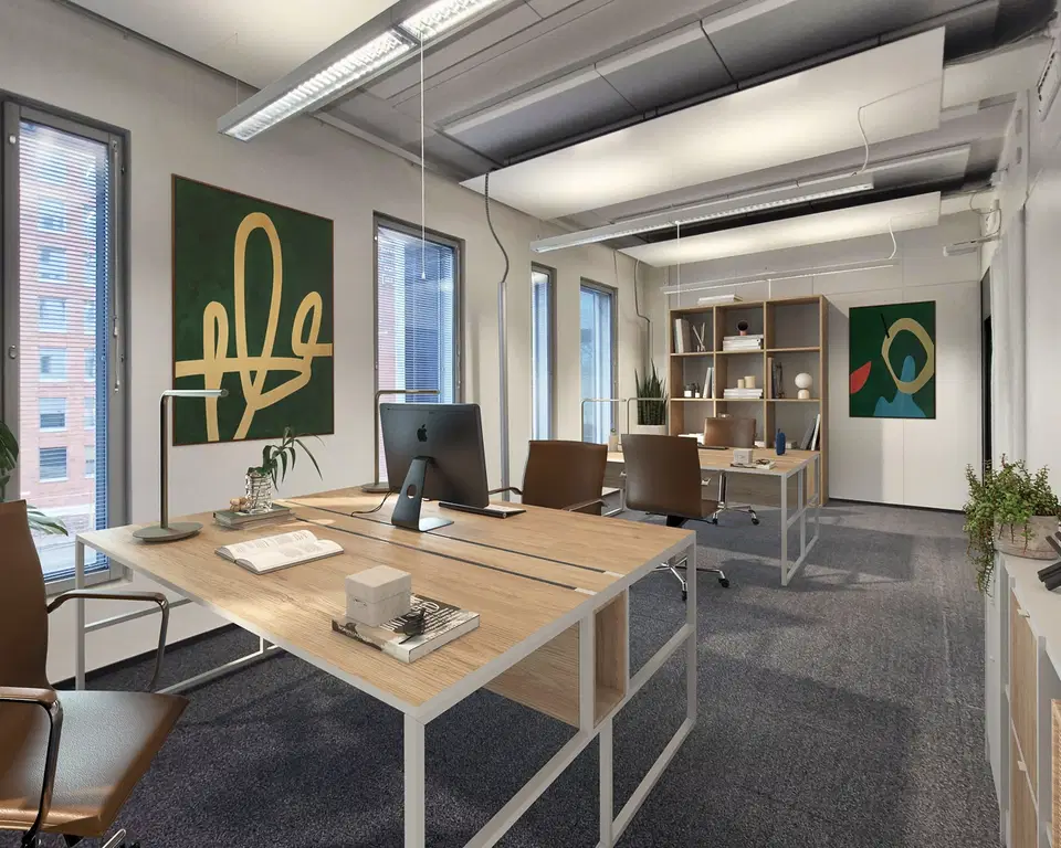Tilan hinta on 2100 €/kk (alv 0%), sisältäen siivouksen, sähkön, aulapalvelun sekä netin.