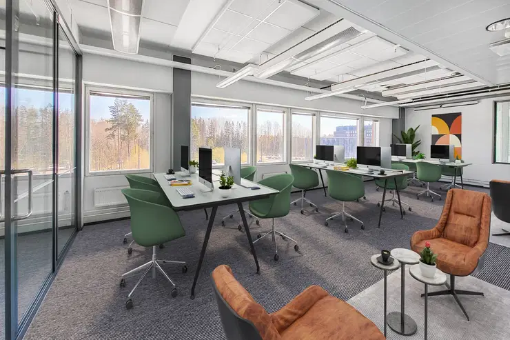 215 m² office space for rent in Technopolis Otaniemi, Espoo, on the third floor of Innopoli 3 C. The space includes open-plan asrea, a meeting room, and kitchen and toilet facilities. The layout can be modified according to the customer's wishes and needs. The air conditioning in the premises ensures a comfortable temperature throughout the year.