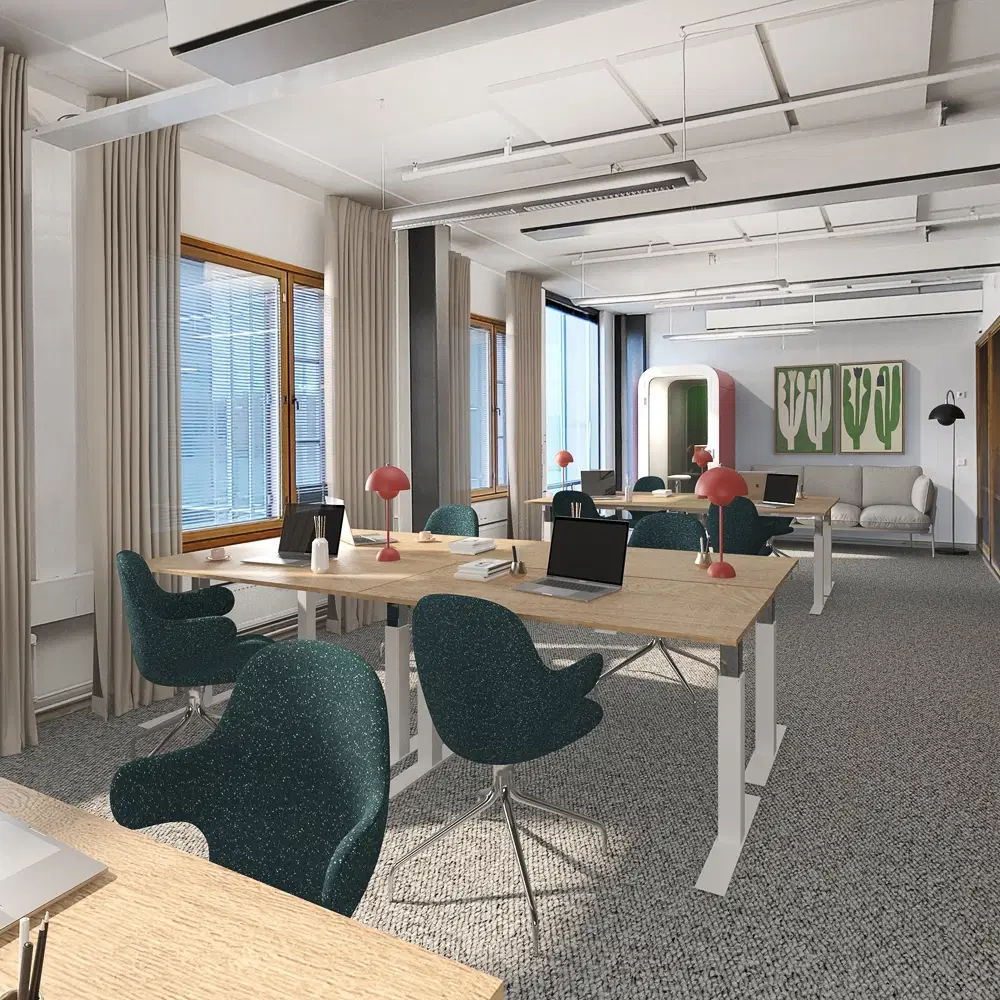 A prestigious 370 m² top-floor office space with a functional layout is available for rent at Technopolis Otaniemi in Espoo. This bright and spacious office features plenty of open-plan space, several rooms, a private kitchen, and restroom facilities. A ready-made furnished floor plan is available, illustrating the workstation capacity and different work areas. The space can also be combined with the adjacent 215 m² office space. These premises are located in the Innopoli 3 building. The office is equipped with air conditioning to ensure a comfortable temperature year-round.
