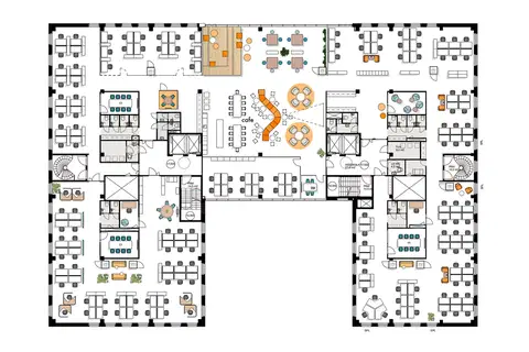 Entire private 1,514 m² office floor available for rent in the newest building at Technopolis Ruoholahti campus, Helsinki. The space offers a versatile selection of team and meeting rooms, as well as a large, unified kitchen area designed to accommodate even bigger team gatherings. The office is equipped with air conditioning to ensure a comfortable temperature year-round. A ready-made furnished floor plan is available, illustrating the workstation capacity and different work areas.