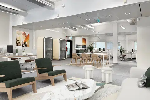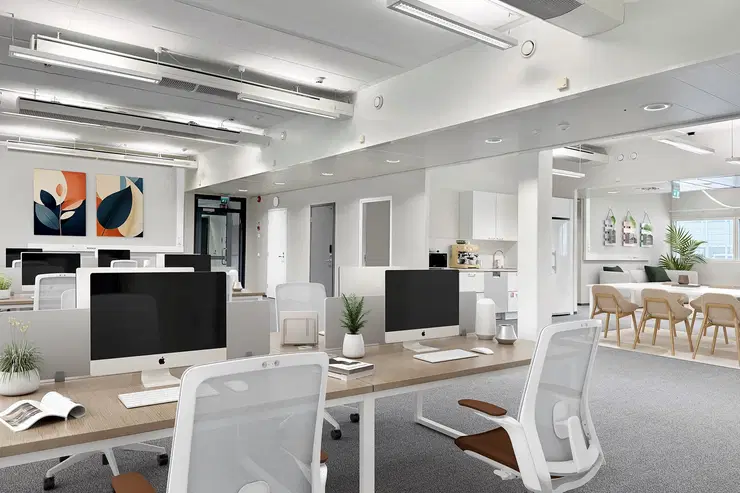 The space has an open workspace, offices and two large conference rooms (for 16 and 12 people), which enable smooth teamwork and client work. A luxurious café-like break room, which serves as both a place to relax and an informal meeting space, provides special comfort. In addition, modern kitchen facilities and toilets are available.