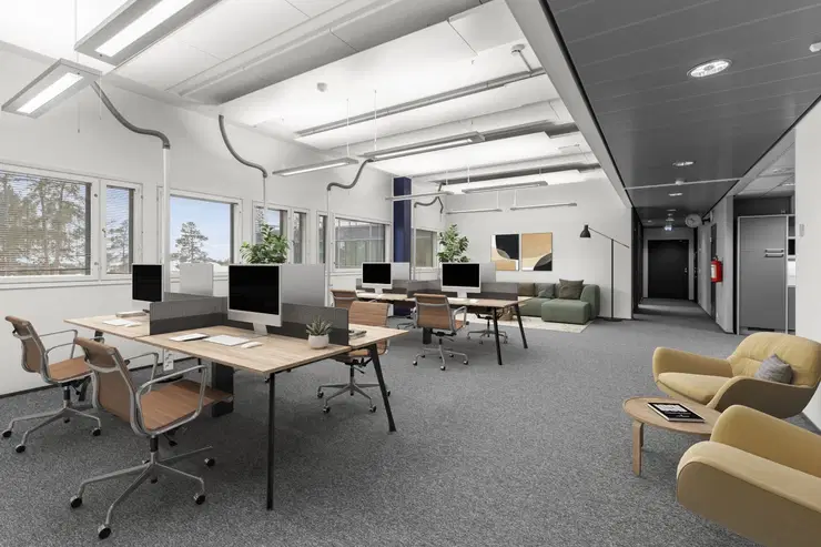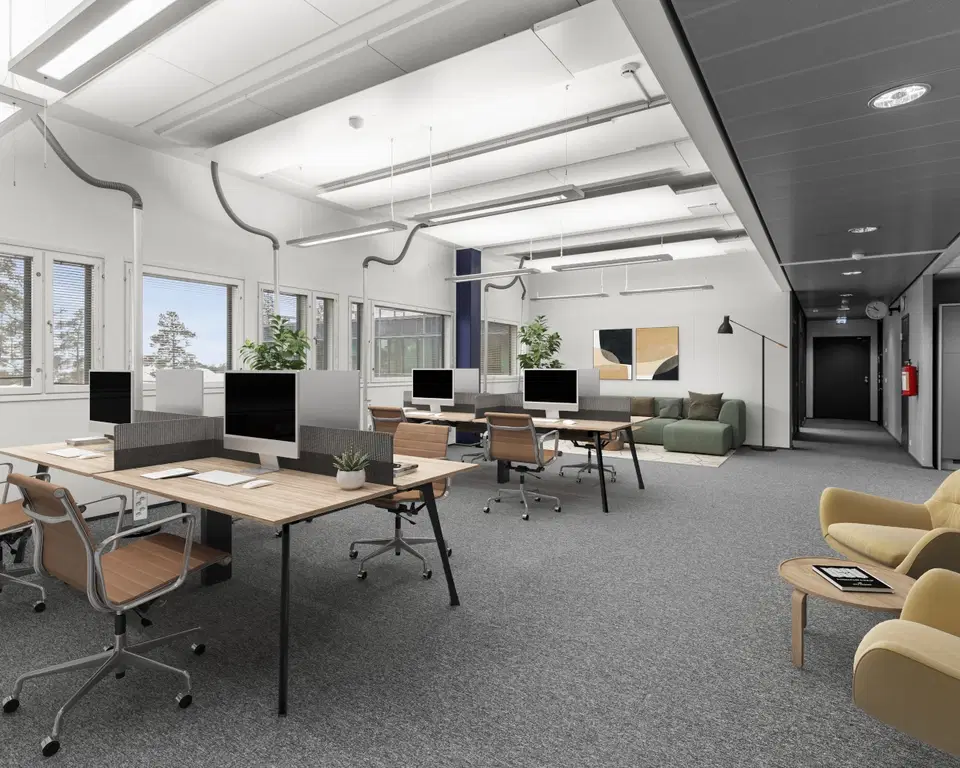 For lease a move-in-ready 118 m² activity-based office located on the second floor of Building D at Technopolis Aviapolis in Vantaa. The space includes open-plan areas, two rooms, as well as its own kitchen and restroom facilities. The office is equipped with air conditioning to ensure a comfortable temperature year-round.